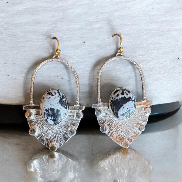 White Buffalo Turquoise, Silver, and 22k gold accents. Ear wires are heavily plated 24k gold, but may be switched to sterling.